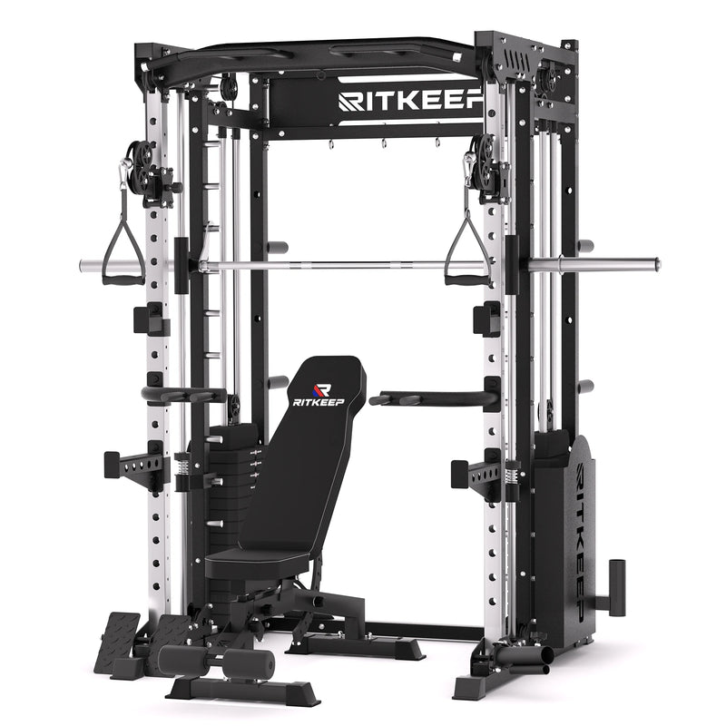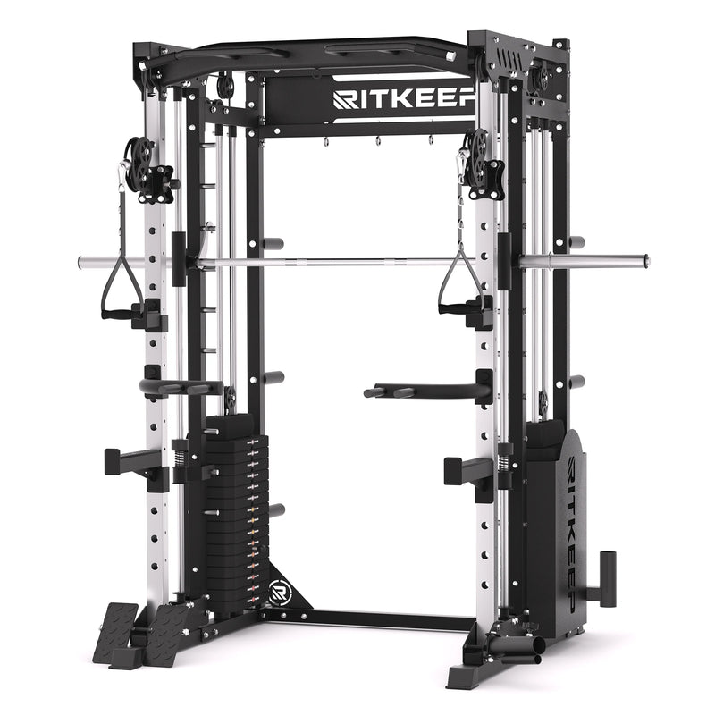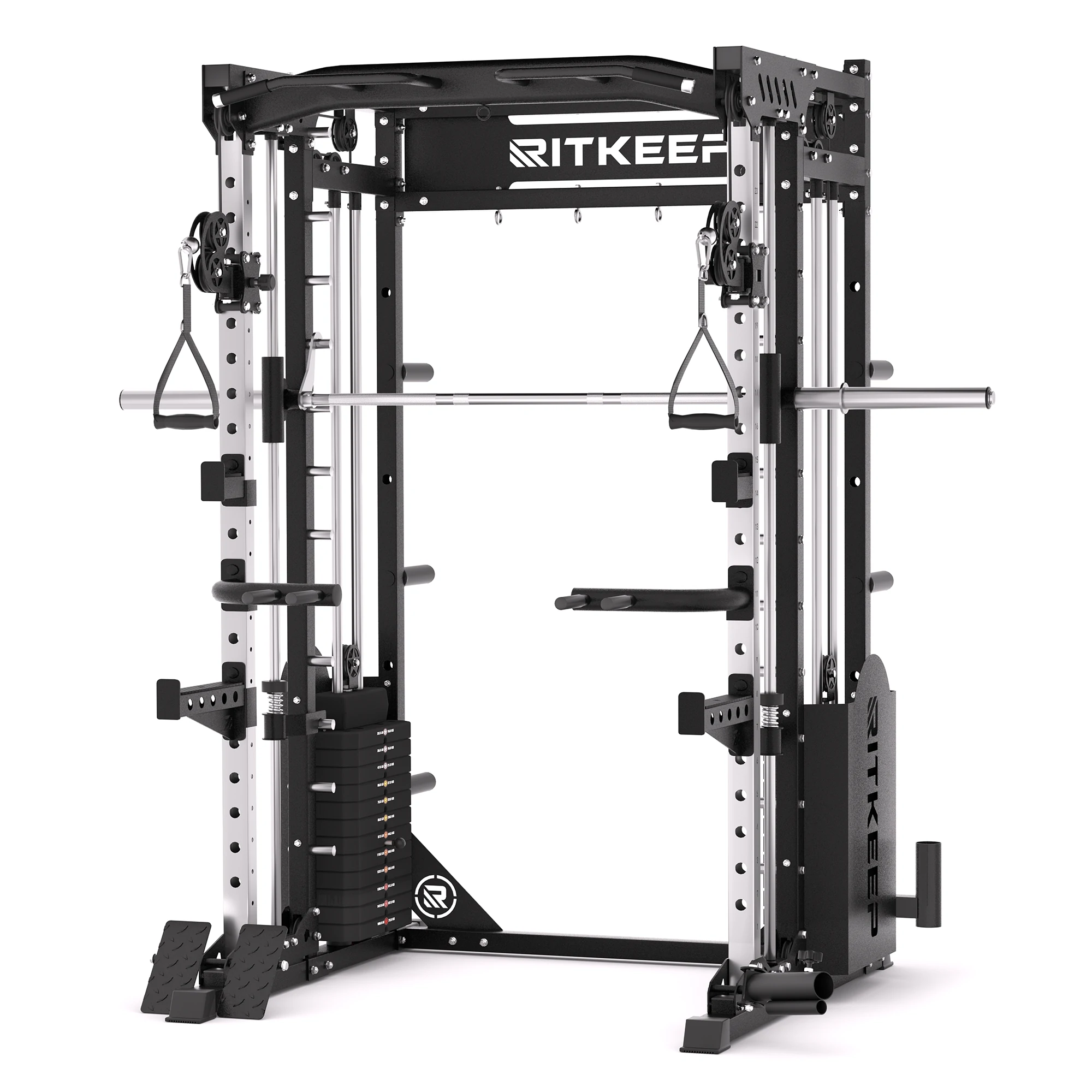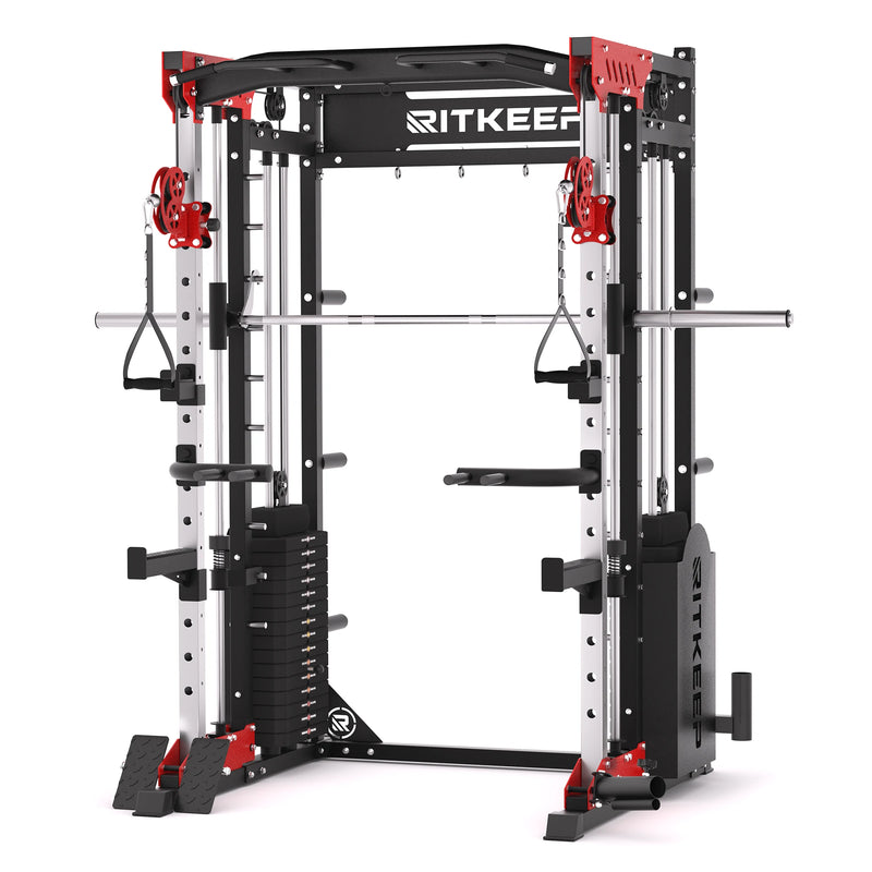 Ritkeep PMAX 5600 Home Gym Smith Machine is the top of our Premium Series lineup, it combines 6 Strength Training Machines in ONE SINGLE MACHINE, including the Power Rack, Crossover System, Smith Machine, Chin-up Station, Dip Station, and Low Row, making it the perfect for strengthening different muscle groups and executing comprehensive workouts without switching between equipment!