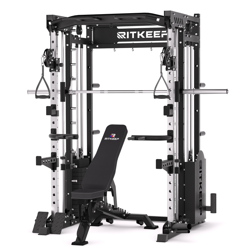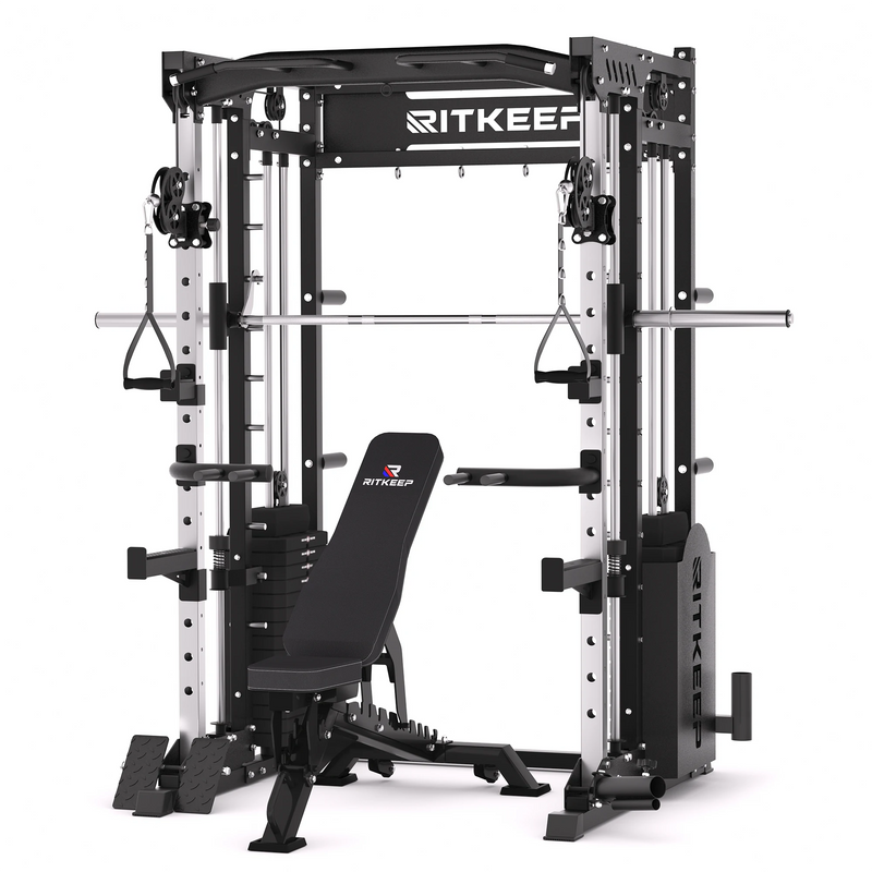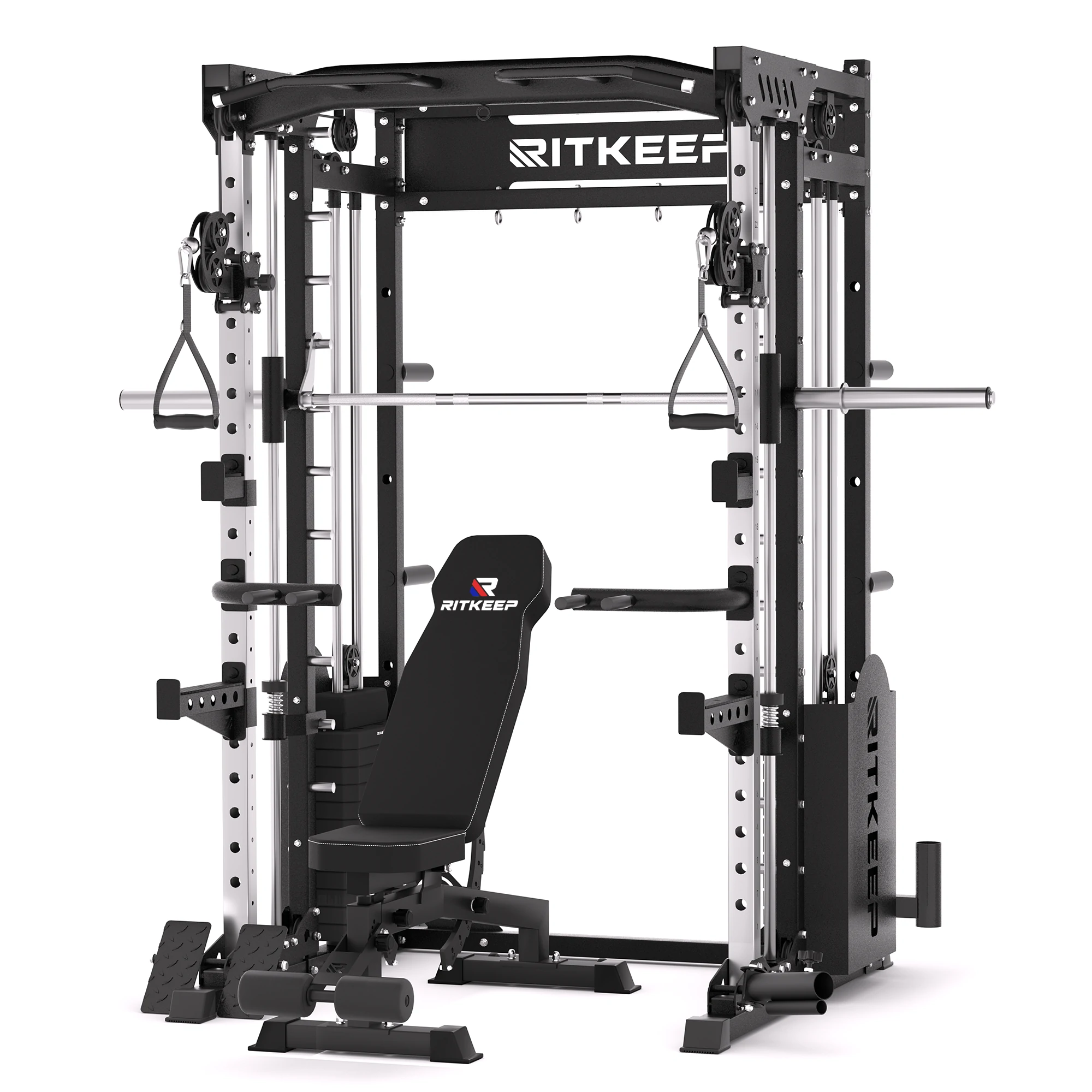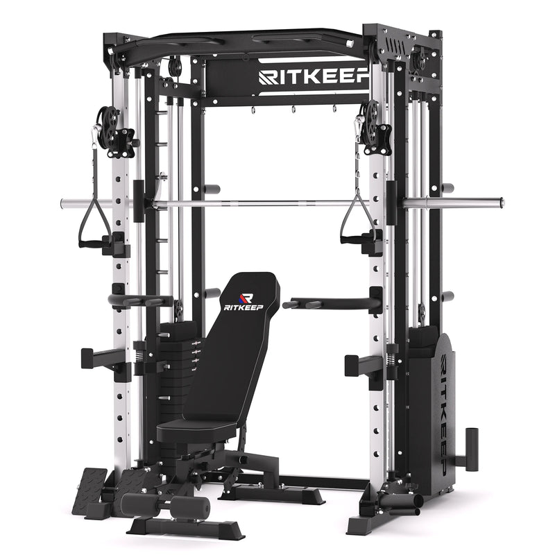 Ritkeep PMAX 5600 Home Gym Smith Machine is the top of our Premium Series lineup, it combines 6 Strength Training Machines in ONE SINGLE MACHINE, including the Power Rack, Crossover System, Smith Machine, Chin-up Station, Dip Station, and Low Row, making it the perfect for strengthening different muscle groups and executing comprehensive workouts without switching between equipment!