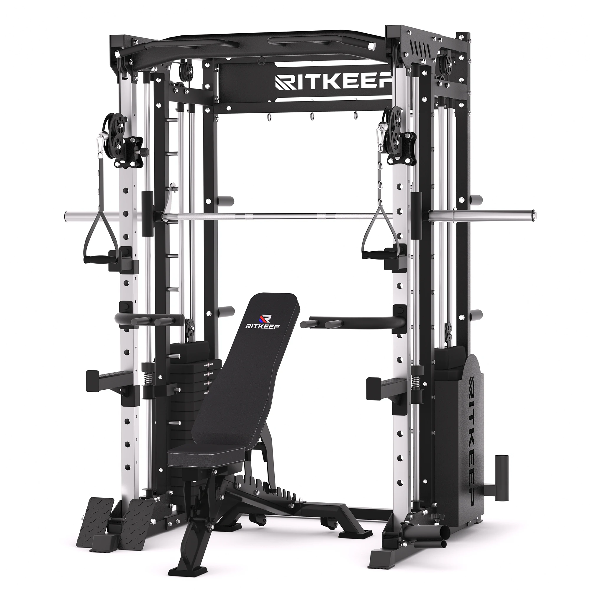 Ritkeep PMAX 5600 Home Gym Smith Machine Made with a 14-gauge heavy-duty steel frame reinforced with a durable powder-coated finish, this home smith machine utilizes sturdy aircraft cable with a tensile strength of 1500 lb it allows for boundless potential to accelerate your training while remaining safe and protected.