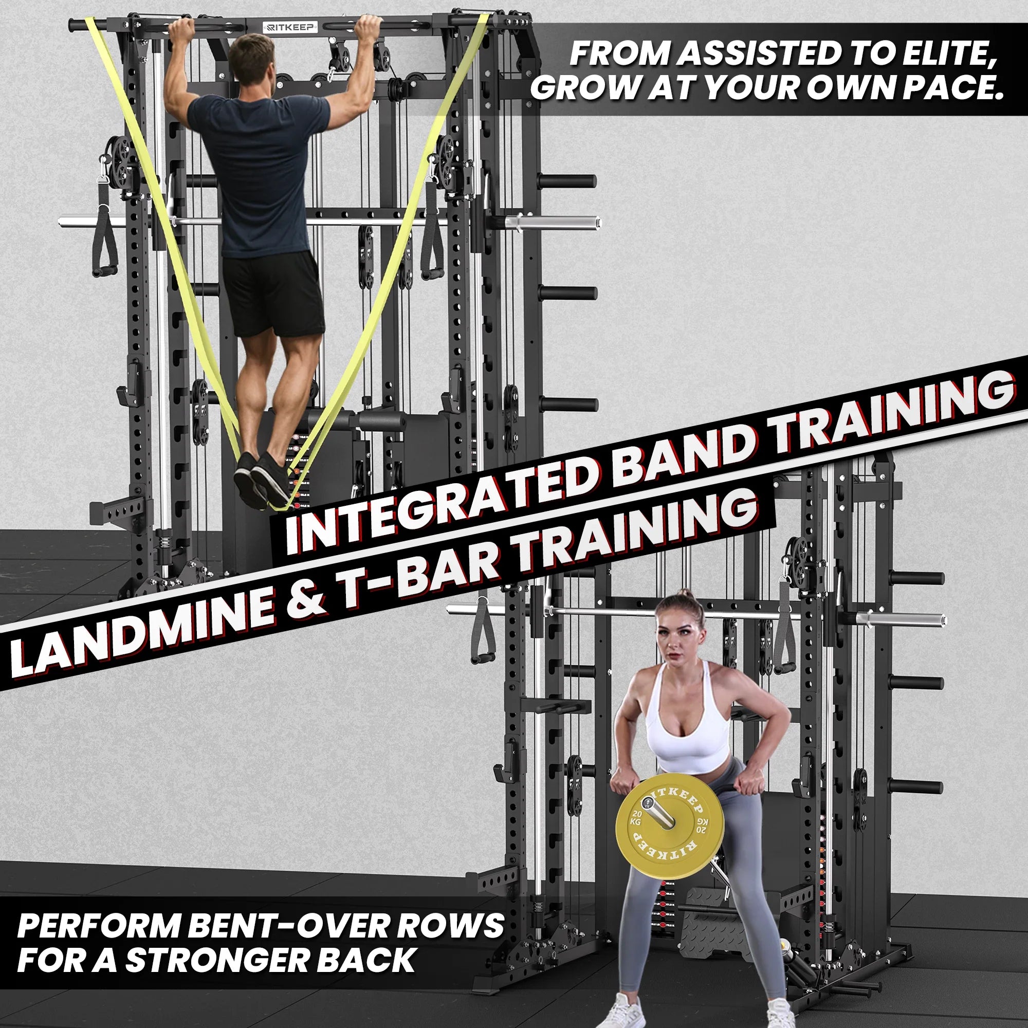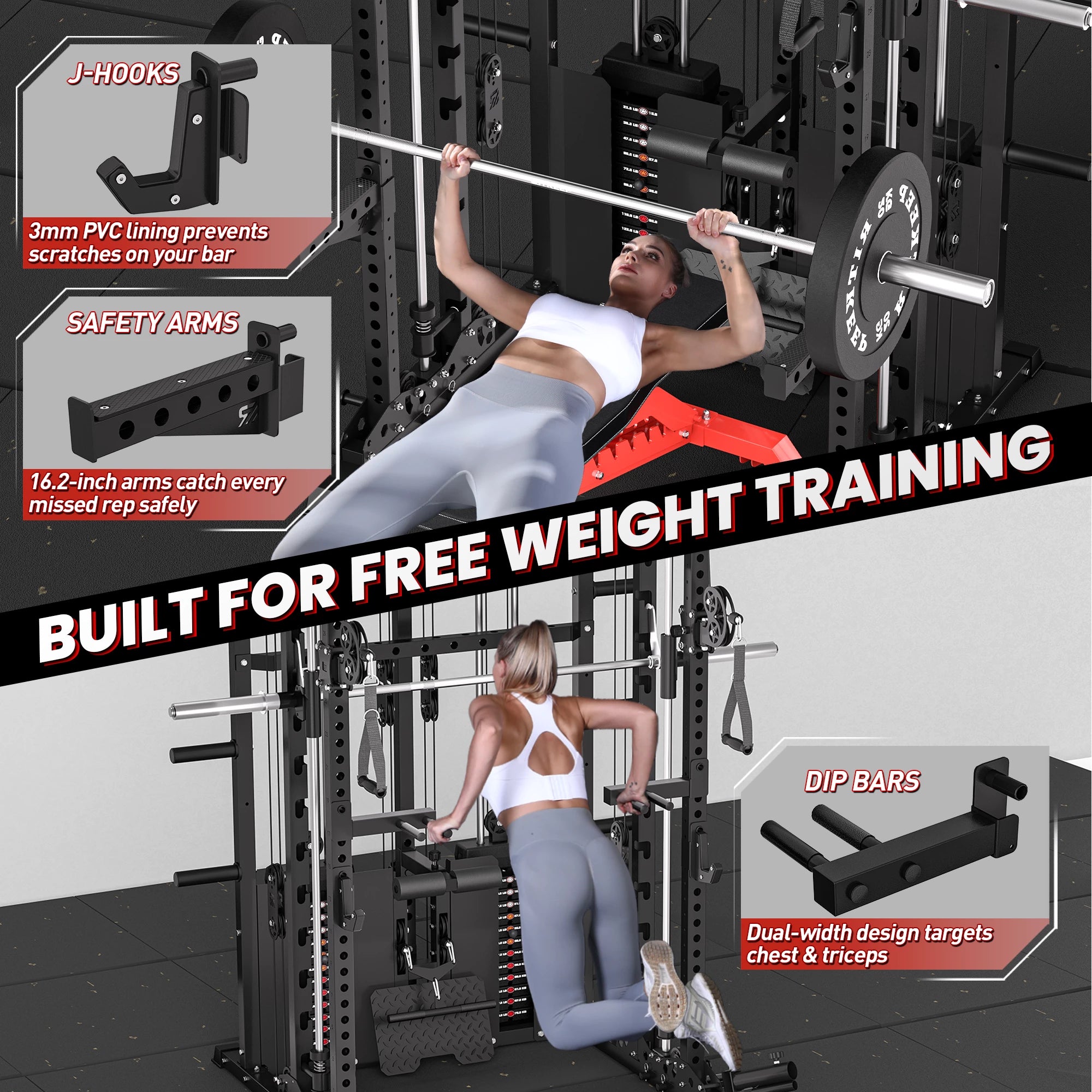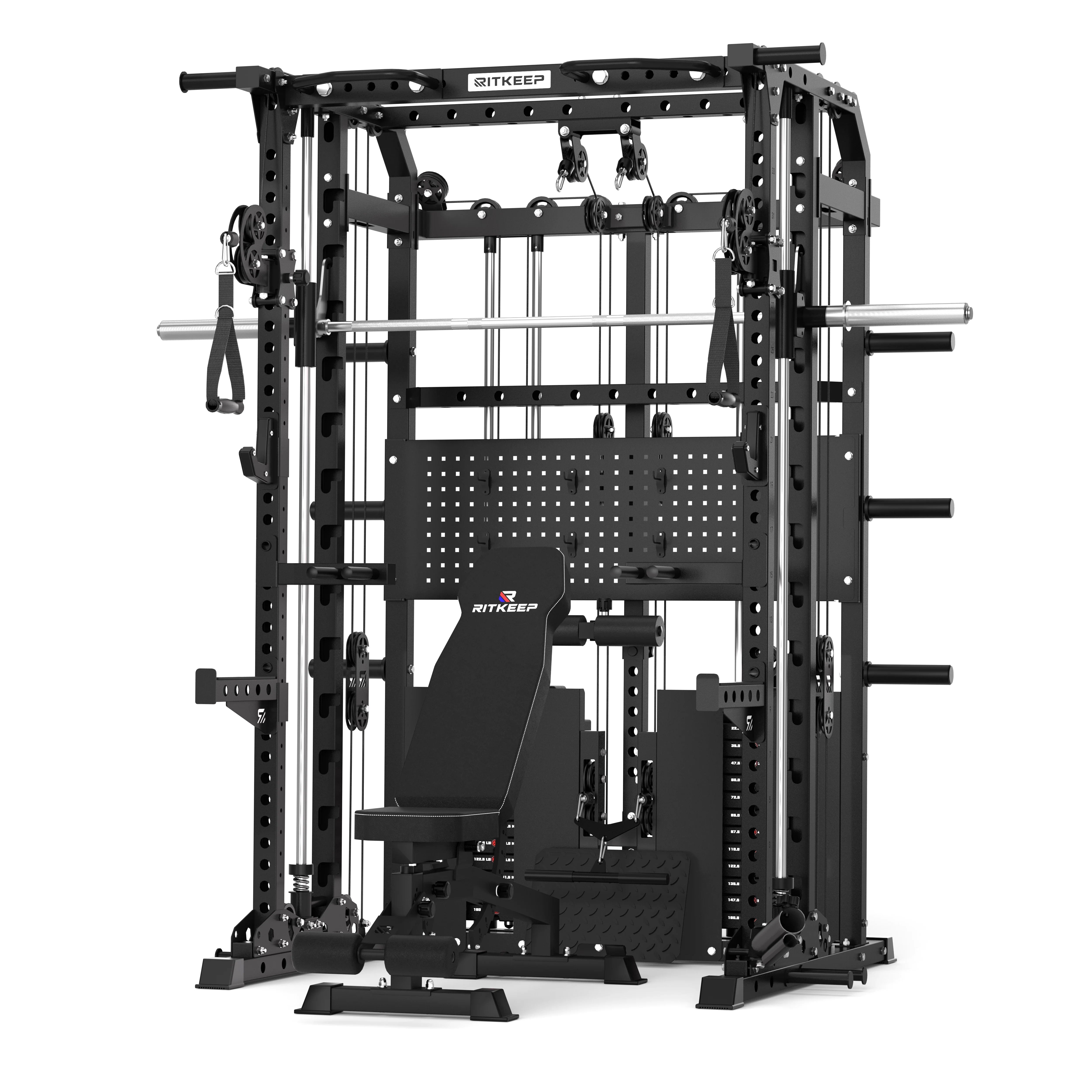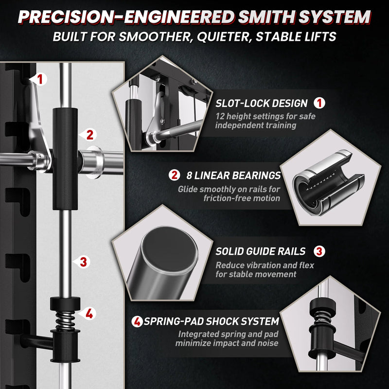 The integrated resistance band system adds dynamic, progressive tension to both free-weight and Smith training. Easily attach bands at the base for squats, presses, and rows, or use the side pegs to assist pull-ups with smooth, controlled support, expanding training variety and intensity.