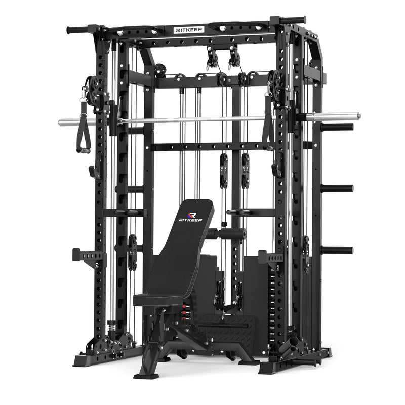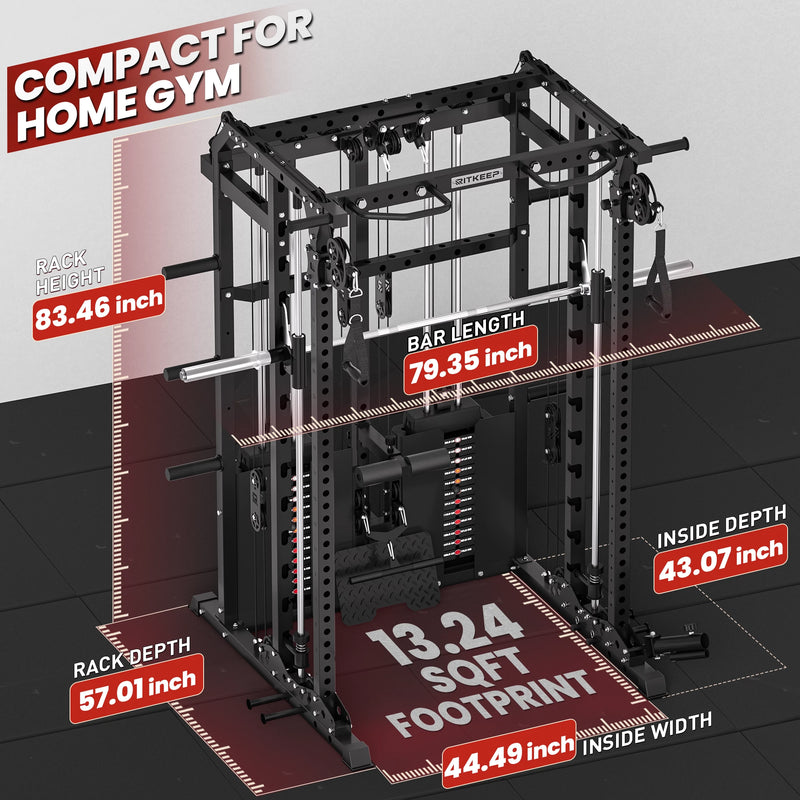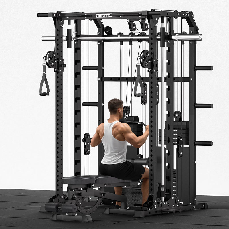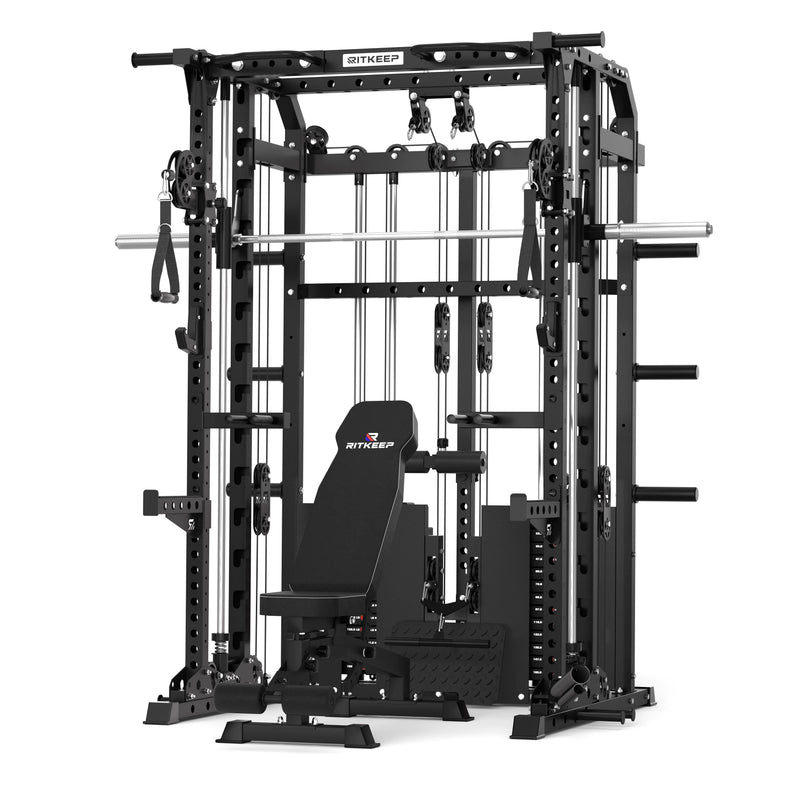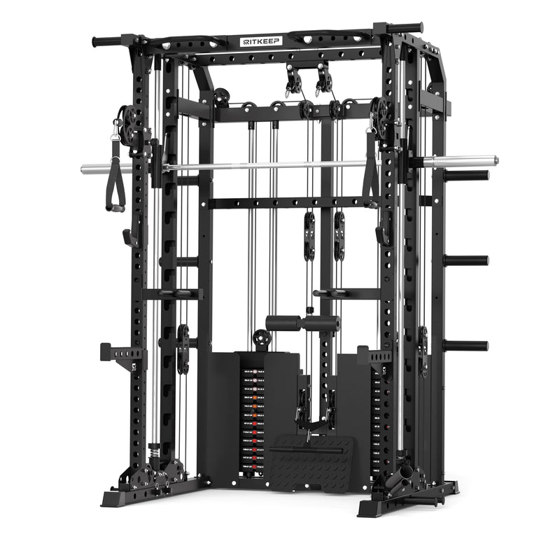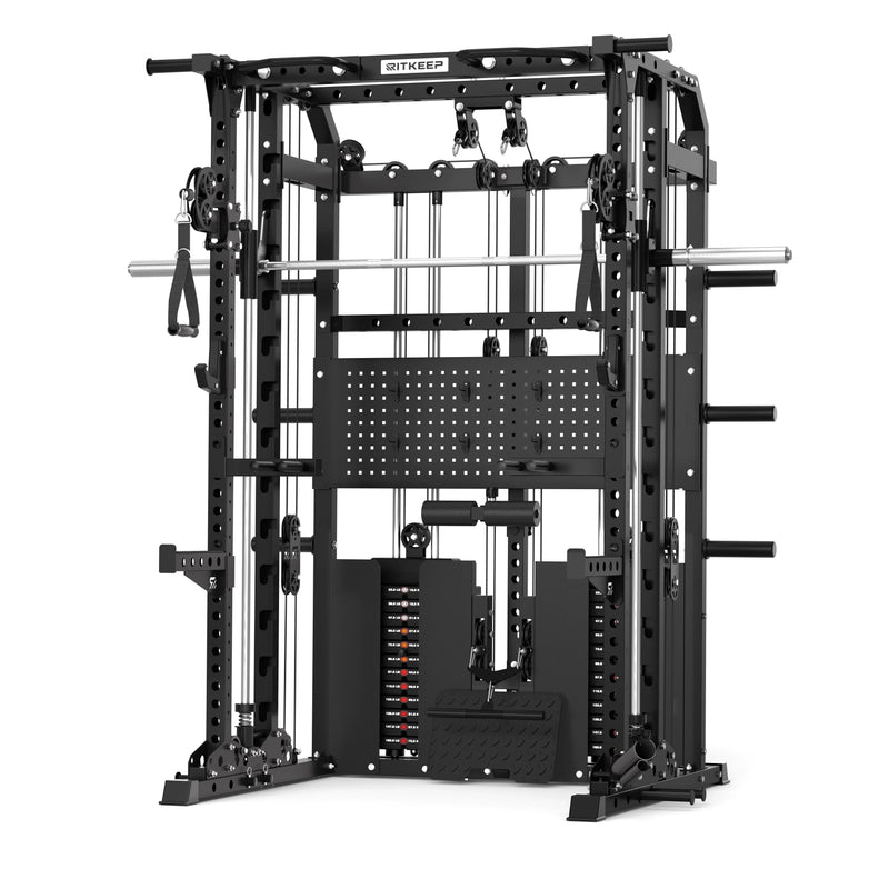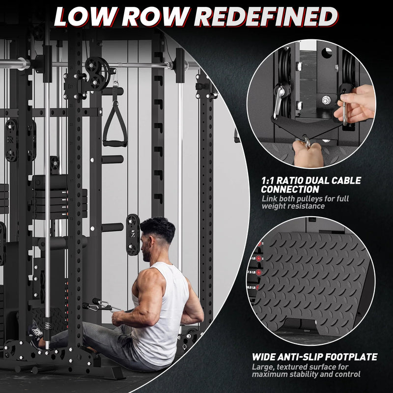 This versatile system combines a Smith machine, functional trainer, power rack, pull-up station, and low row in one space-saving unit, allowing seamless transitions between strength and functional workouts.