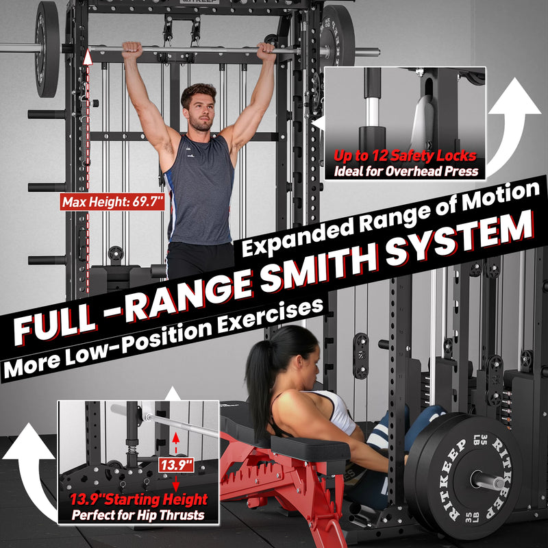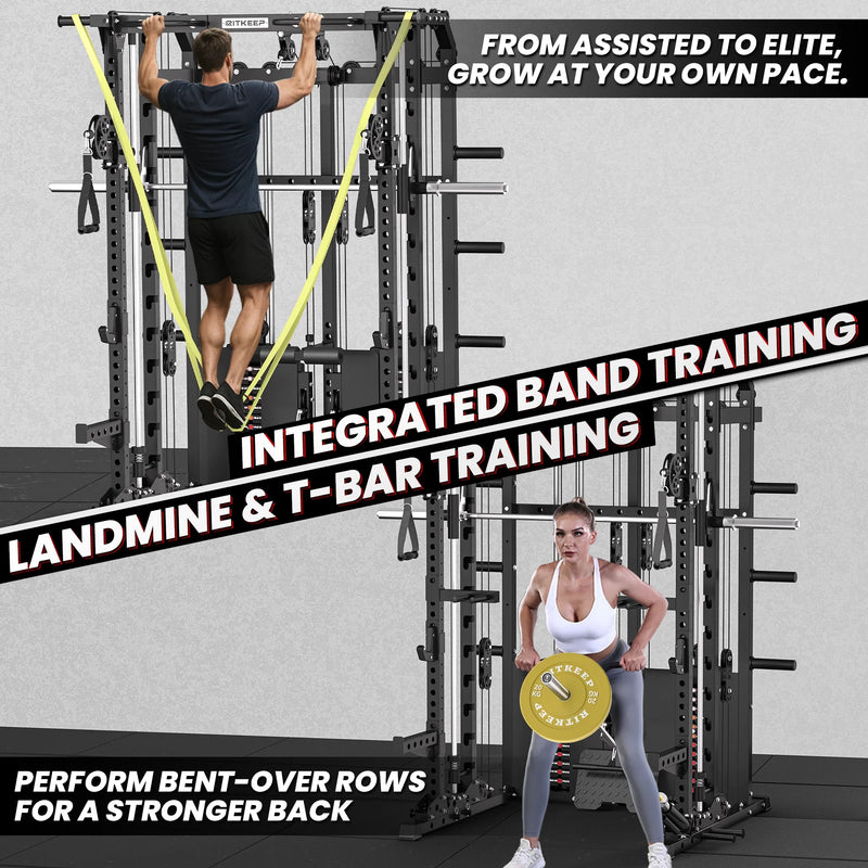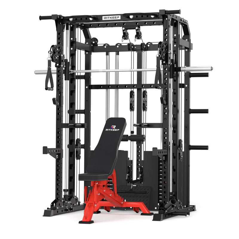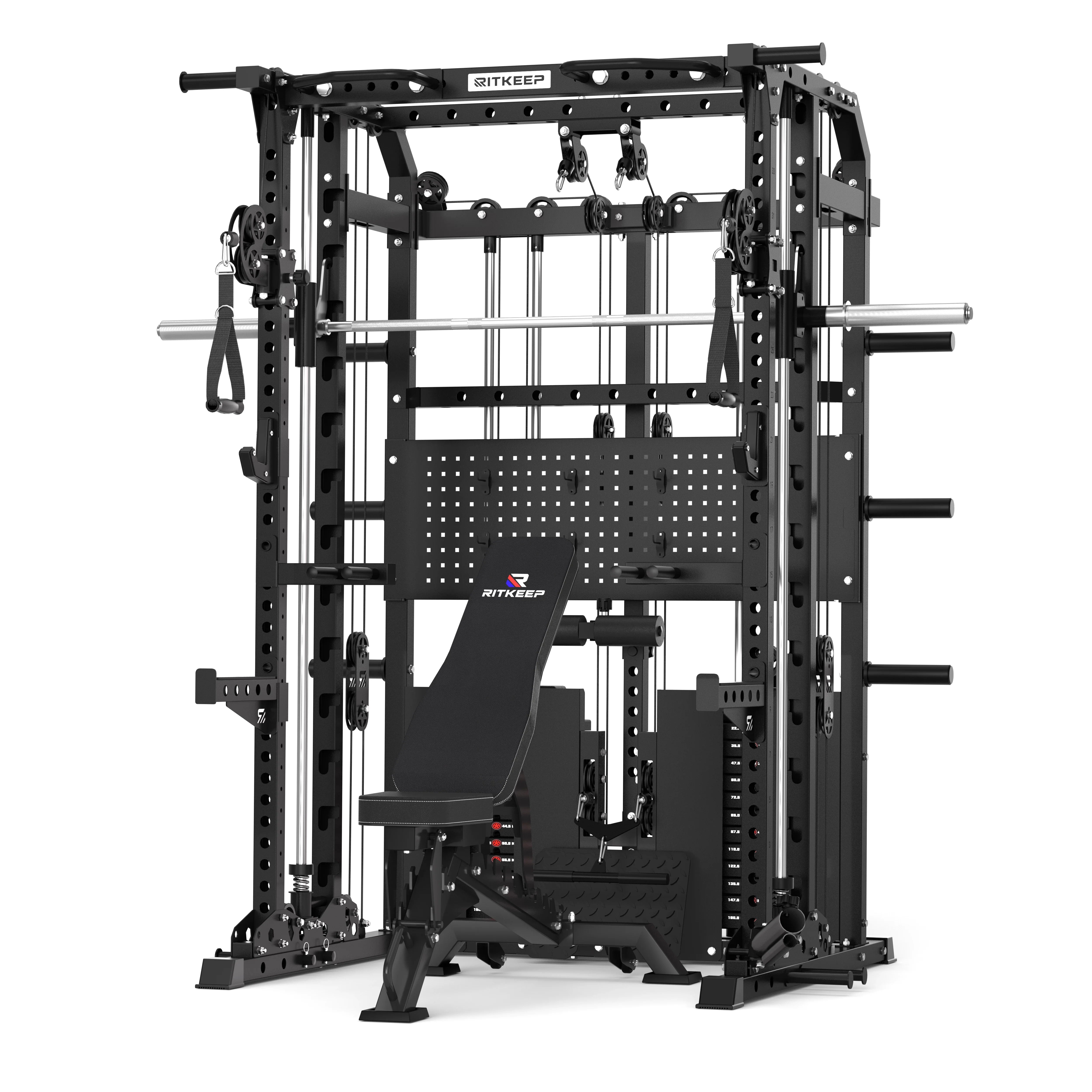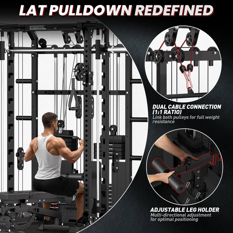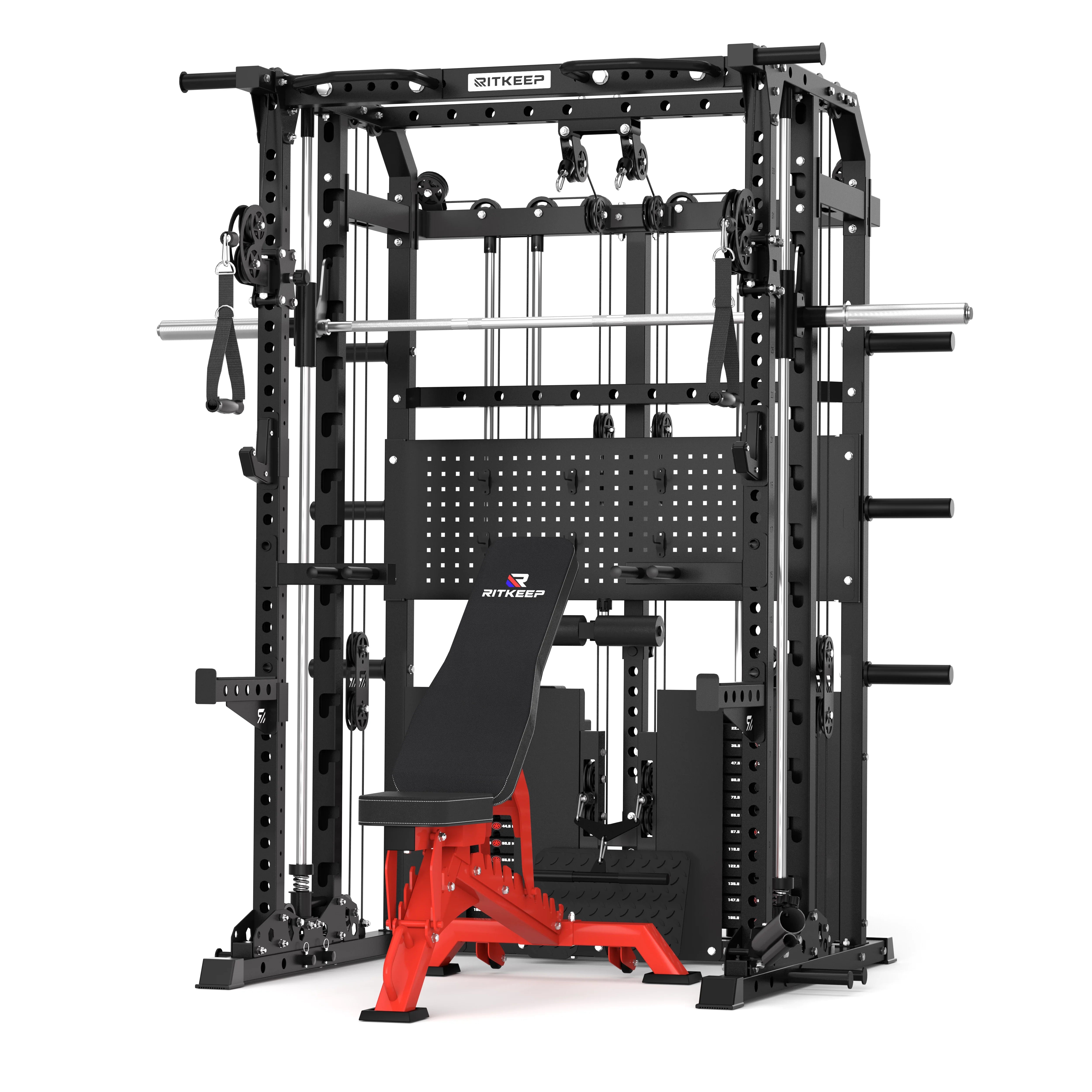 This versatile system combines a Smith machine, functional trainer, power rack, pull-up station, and low row in one space-saving unit, allowing seamless transitions between strength and functional workouts.