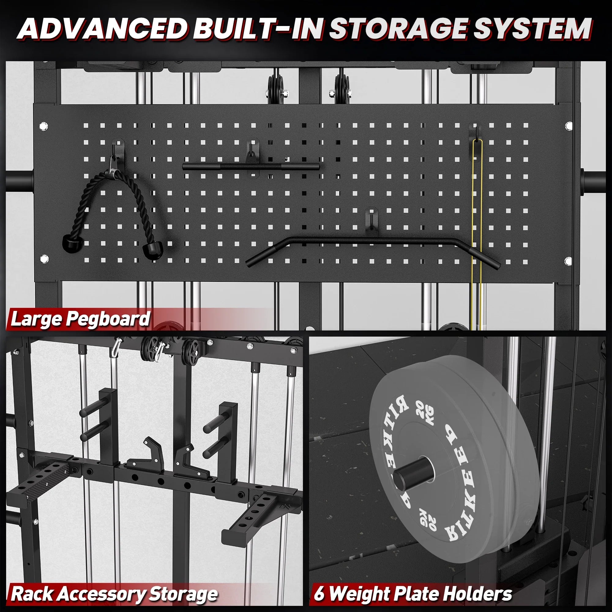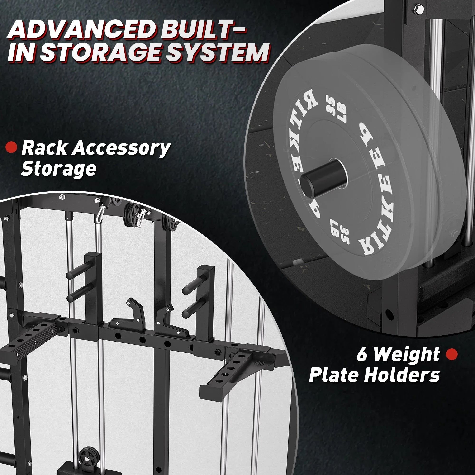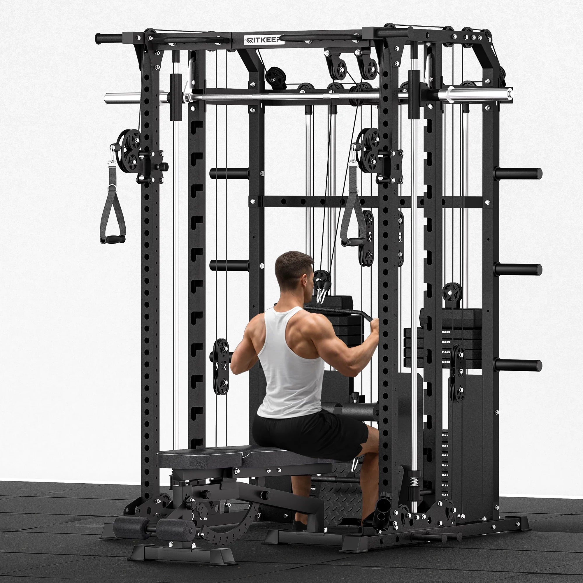 The integrated top storage slot keeps the Smith bar secured at the highest point of the frame, freeing up interior space for lat pulldowns, rows, and cable exercises, creating a more open and efficient training area.