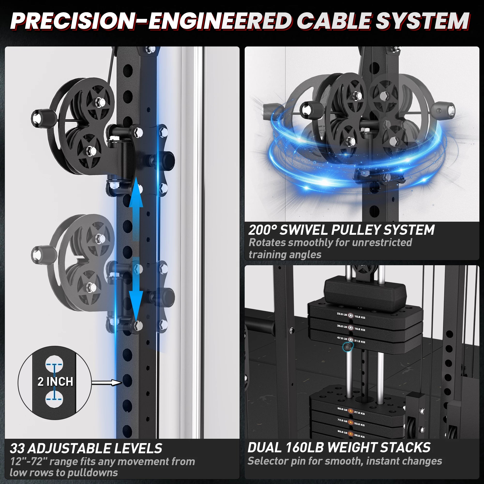 - 200° rotating pulleys support multi-directional training and flexible space use, allowing multiple users to train without crowding.