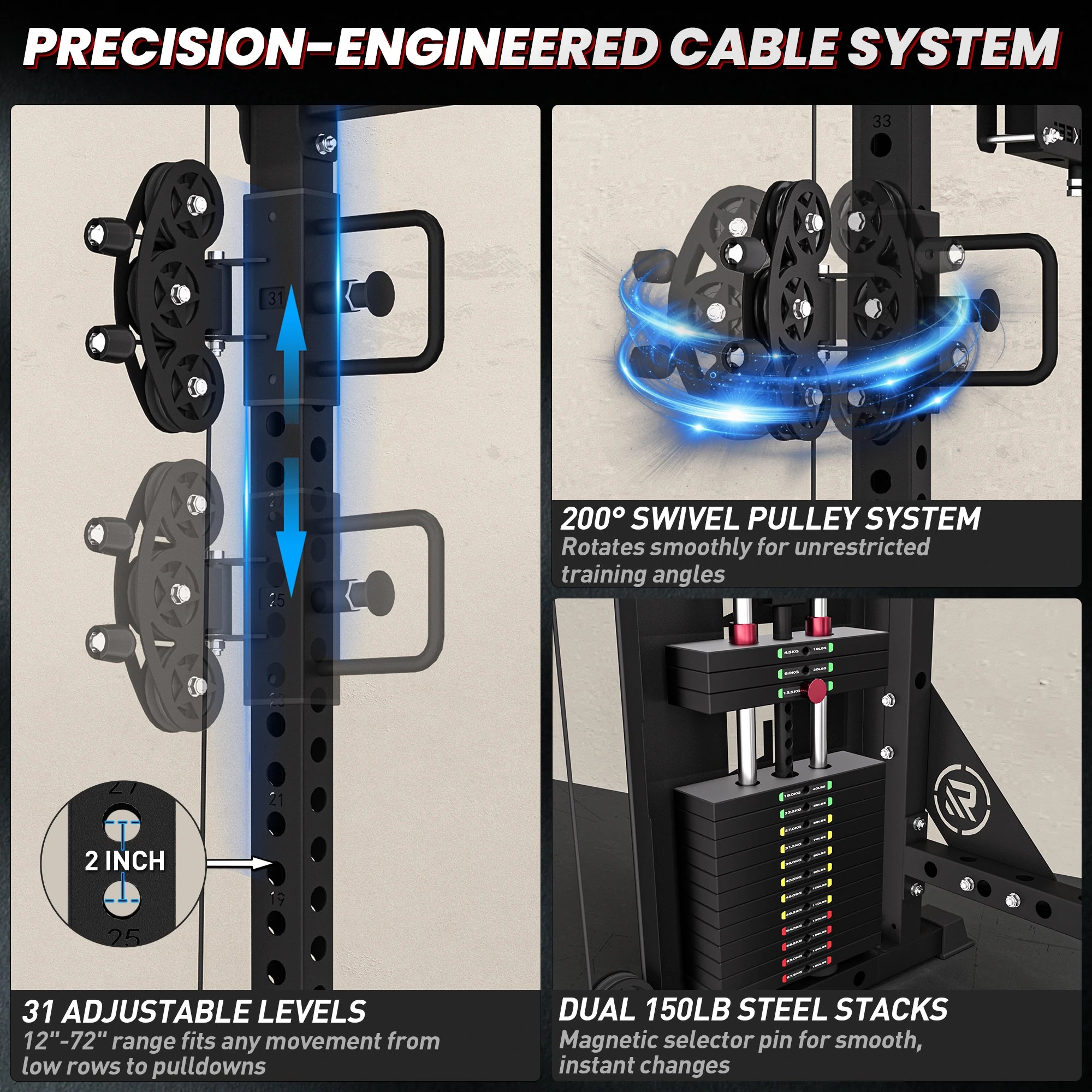 - Dual independent 150 lb precision steel weight stacks with magnetic selector pins for quick, accurate resistance changes.